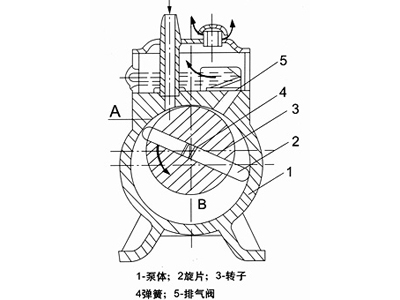 旋片泵主要由泵體、轉子、旋片、端蓋、彈簧等組成。在旋片泵的腔內偏心地安裝一個轉子,轉子外圓與泵腔內表面相切(二者有很小的間隙),轉子槽內裝有帶彈簧的二個旋片。旋轉時,靠離心力和彈簧的張力使旋片頂端與泵腔的內壁保持接觸,轉子旋轉帶動旋片沿泵腔內壁滑動。真空泵兩個旋片把轉子、泵腔和兩個端蓋所圍成的月牙形空間分隔成A、B、C三部分,當轉子按箭頭方向旋轉時,與吸氣口相通的空間A 的容積是逐漸增大的,正處于吸氣過程。而與排氣口相通的空間C的容積是逐漸縮小的,正處于排氣過程。居中的空間B的容積也是逐漸減小的,正處于壓縮過程。真空泵由于空間A的容積是逐漸增大(即膨脹),真空泵氣體壓強降低,泵的入口處外部氣體壓強大于空間A內的壓強,因此將氣體吸入。當空間A與吸氣口隔絕時,即轉至空間B的位置,氣體開始被壓縮,容積逐漸縮小,最后與排氣口相通。當被壓縮氣體超過排氣壓強時,排氣閥被壓縮氣體推開,真空泵氣體穿過油箱內的油層排至大氣中。由泵的連續運轉,達到連續抽氣的目的。如果排出的氣體通過氣道而轉入另一級(低真空級),由低真空級抽走,再經低真空級壓縮后排至大氣中,即組成了雙級泵。旋片式真空泵這時總的壓縮比由兩級來負擔,因而提高了極限真空度。